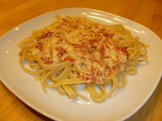 So I've made a few attempts at recreating it at home. It's a lot like the Alfredo sauce, but I've reduced the amount of butter. Adding that much fat to an item that is packed in oil turns out to be a greasy mess. Oil-packed sundried tomatoes will release some of the oil they've retained when they are cooked, so it's best to trim some fat.